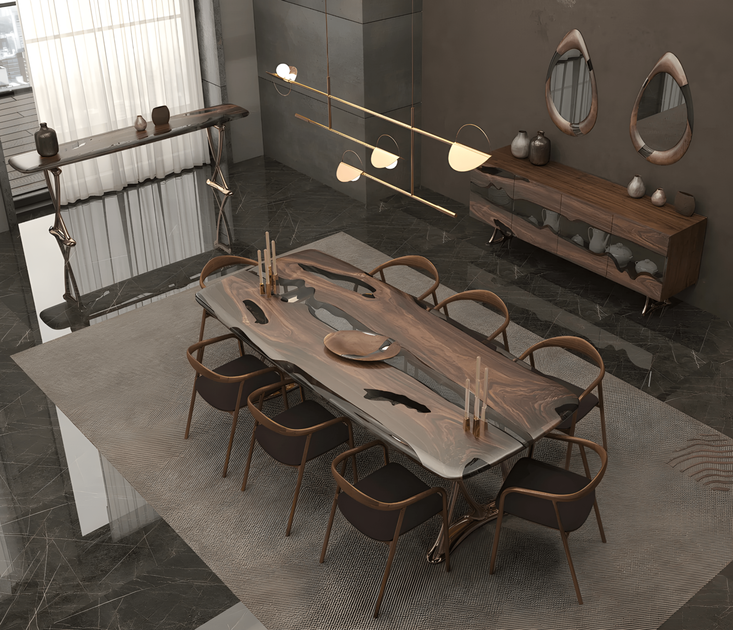 Crafted from exquisite walnut wood, Medma Collection embodies the perfect harmony of nature and craftsmanship. Its rich, organic patterns are preserved under crystal-clear epoxy, while gold-plated stainless steel legs add a touch of modern luxury. More than just furniture, it’s a statement of timeless sophistication.
