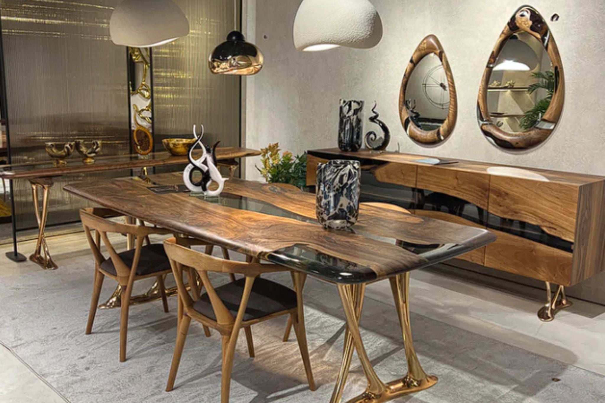 Crafted from rich olive wood and gold-plated stainless steel, the Efil round dining table is finished with crystal-clear resin epoxy—a timeless blend of luxury and craftsmanship.